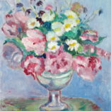 Olej na płycie 60×50 cm. Kompozycja ze zdecydowanymi konturami. O bujnej kolorystyce. Jest tu coś z kubistycznego wysmakowania i fowistycznej dzikości. Ciemne tło interesująco współgra z pierwszym planem. Powieszony na ścianie obraz ten jest w stanie ożywić wnętrze i wnieść z sobą wiele temperamentu.