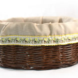Rękodzieło, koszyk ręcznie wykonany z wikliny papierowej. Pomalowany na ciemny brąz. Wnętrze koszyczka wyściełane jest bawełnianym materiałem w kolorze białym w różowe kropeczki. Na zewnątrz ozdobiony kwiatkami w kolorze białym i różowym. Koszyczek można wykorzystać w każdym domu, np. w kuchni lub w łazience.